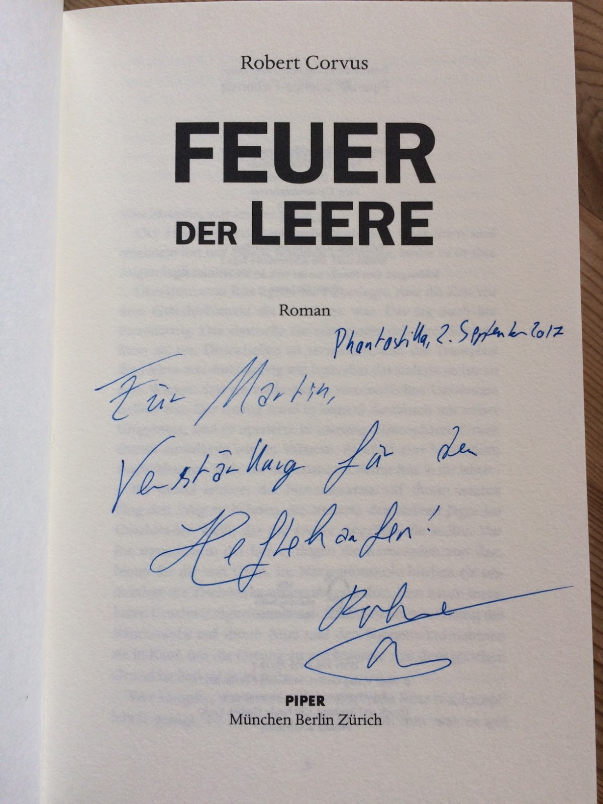 Semirhodanistisch, aber nicht minder Unterhaltsames folgte gleich im Anschluss: Robert Corvus las aus “Feuer der Leere” vor.