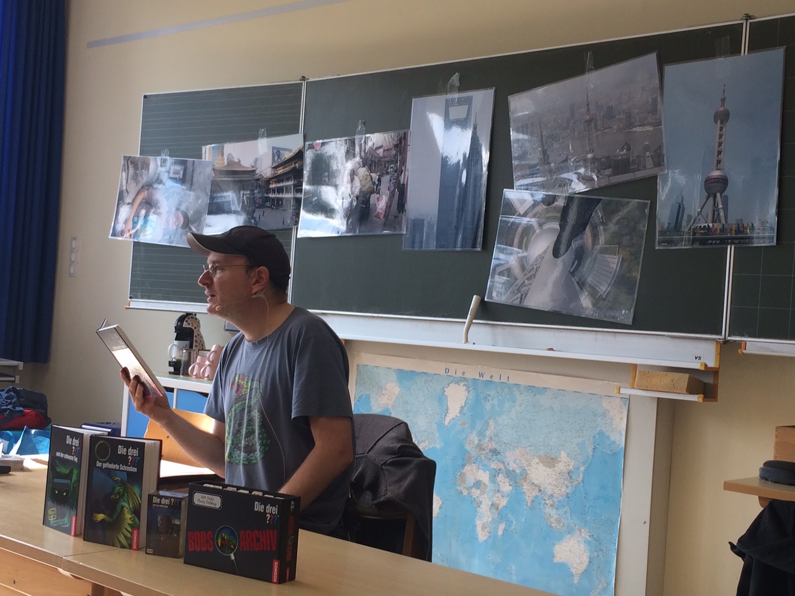 Gebannt lauschten die Schülerinnen und Schüler “Im Bann des Drachen”, einer ???-Folge, in der es die drei Juniordetektive nach Shanghai verschlägt. Christoph garnierte seine Lesung mit einigen Urlaubsfotos, sodass für die Kinder ein lebendiges Bild des Schauplatzes und seiner atemberaubenden Architektur entstand.